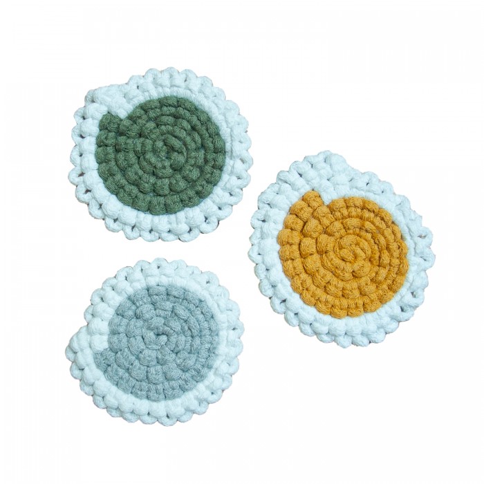 The macrame coaster handmade from recycled yarn.